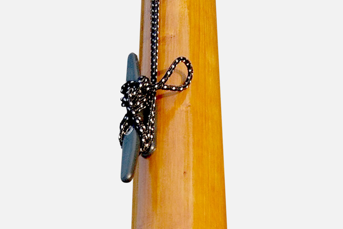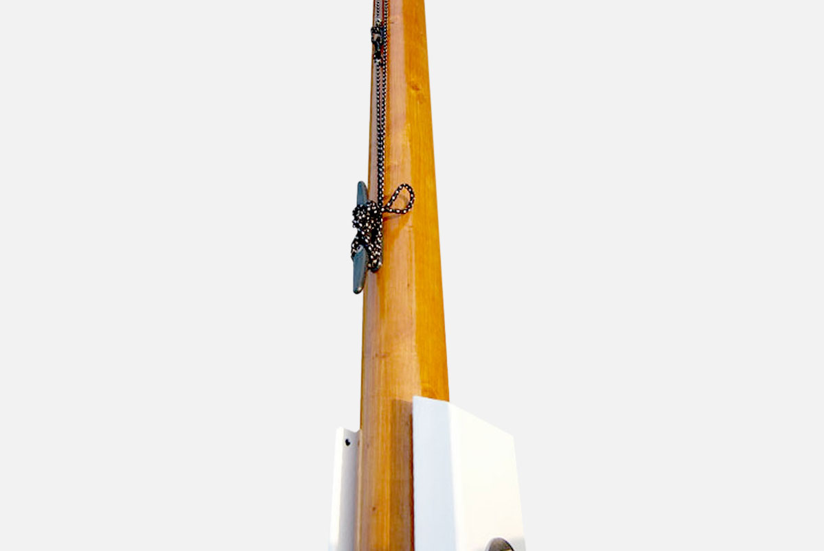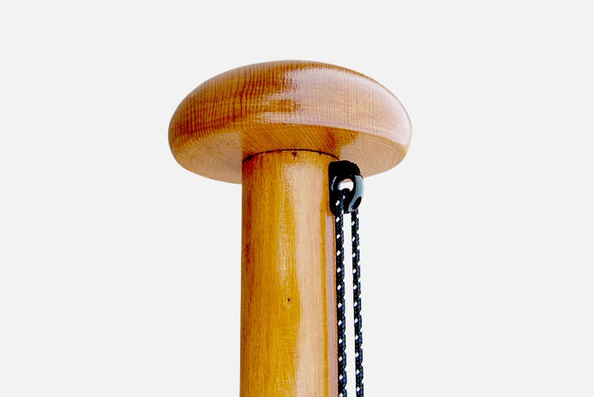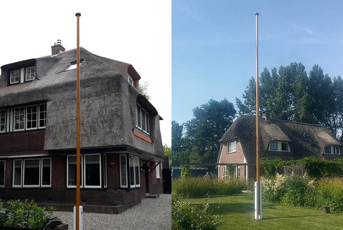 Houten vlaggenmast, conisch 97–72 mm, met houten knop, kikker, geleideoog, en hijskoord. Compleet met stalen mastbok.